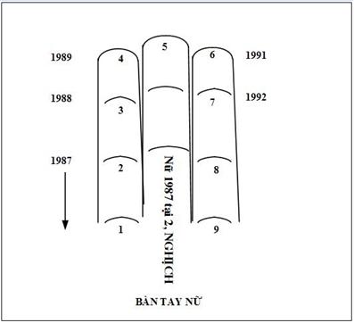 Đây là bàn tay nữ, điểm theo chiều nghịch theo mũi tên chỉ. Năm nay 1987